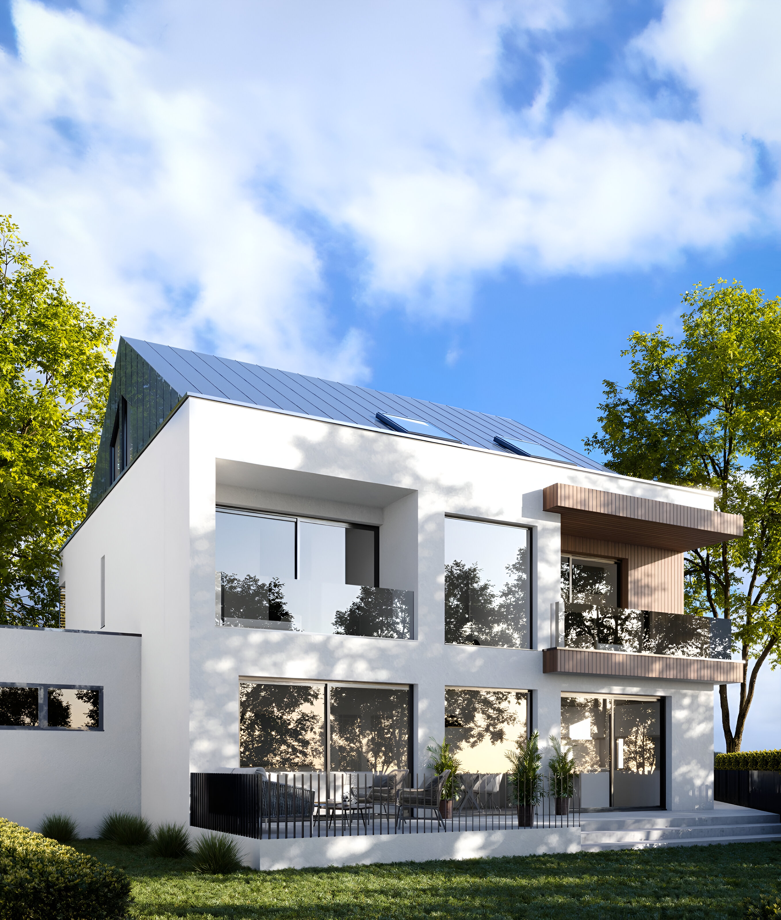 Located in the quiet landscape of Bivange, Luxembourg, this single-family residence is a refined exploration of minimalist geometry and material contrast. The architecture is defined by its crisp, white-washed volumes and a striking asymmetrical gabled roof clad in standing-seam zinc, which lends a sharp, contemporary edge to the traditional suburban silhouette. The street-facing facade is an exercise in private-public balance. A heavy, horizontal plinth of warm vertical timber slats defines the ground floor, seamlessly integrating the garage and main entrance while providing a rich, tactile warmth against the austere white render above. This solid base is punctuated by deeply recessed apertures on the first floor, protected by vertical louvers that manage solar gain and privacy without sacrificing the building’s clean lines. In contrast, the garden elevation opens entirely to the landscape through expansive glass curtain walls and cantilevered volumes. Deeply carved terraces and a sheltered balcony—finished with wood-toned soffits—create "outdoor rooms" that extend the interior living space. This play of voids and solids ensures that the house remains an introverted sanctuary from the street while becoming a light-filled, transparent pavilion at its private core