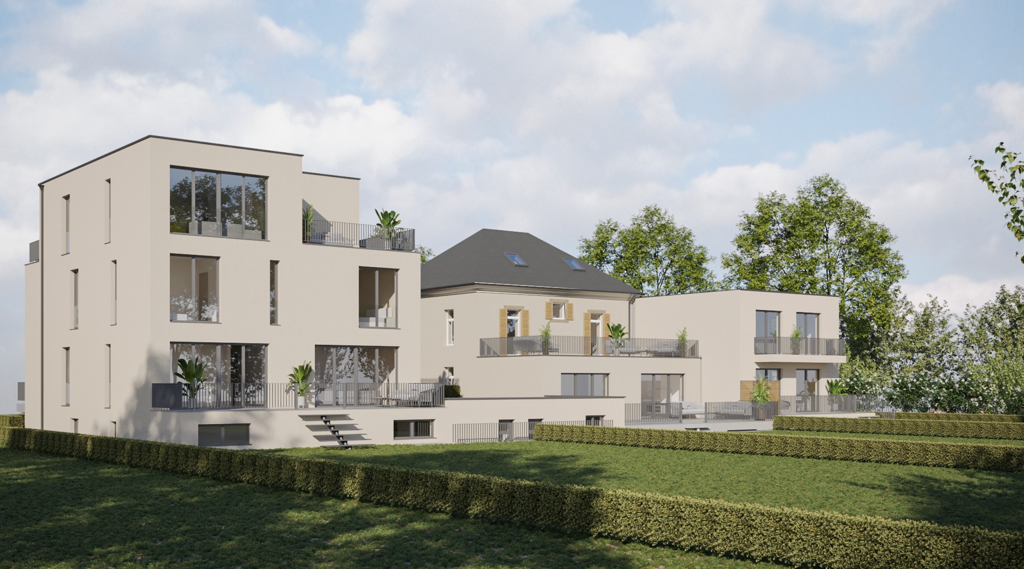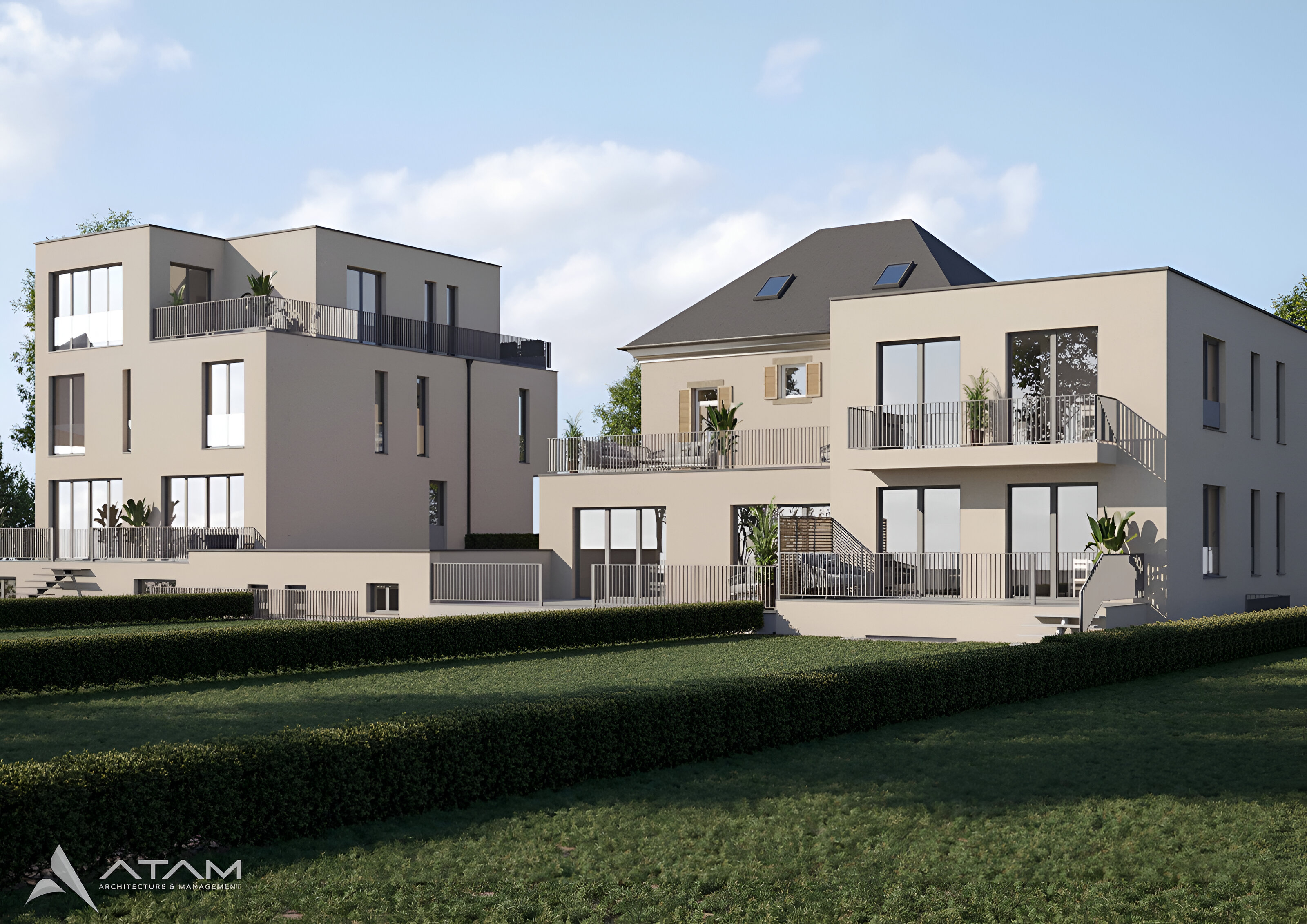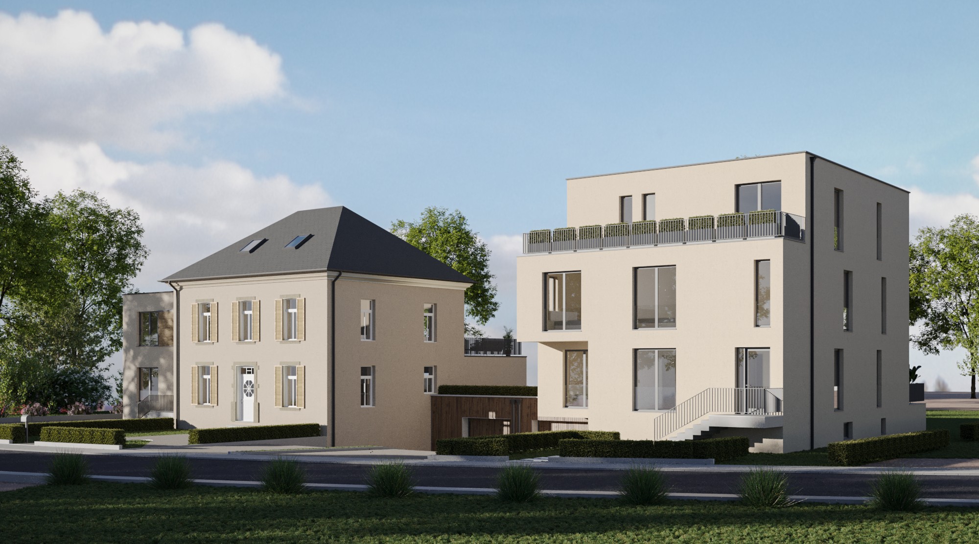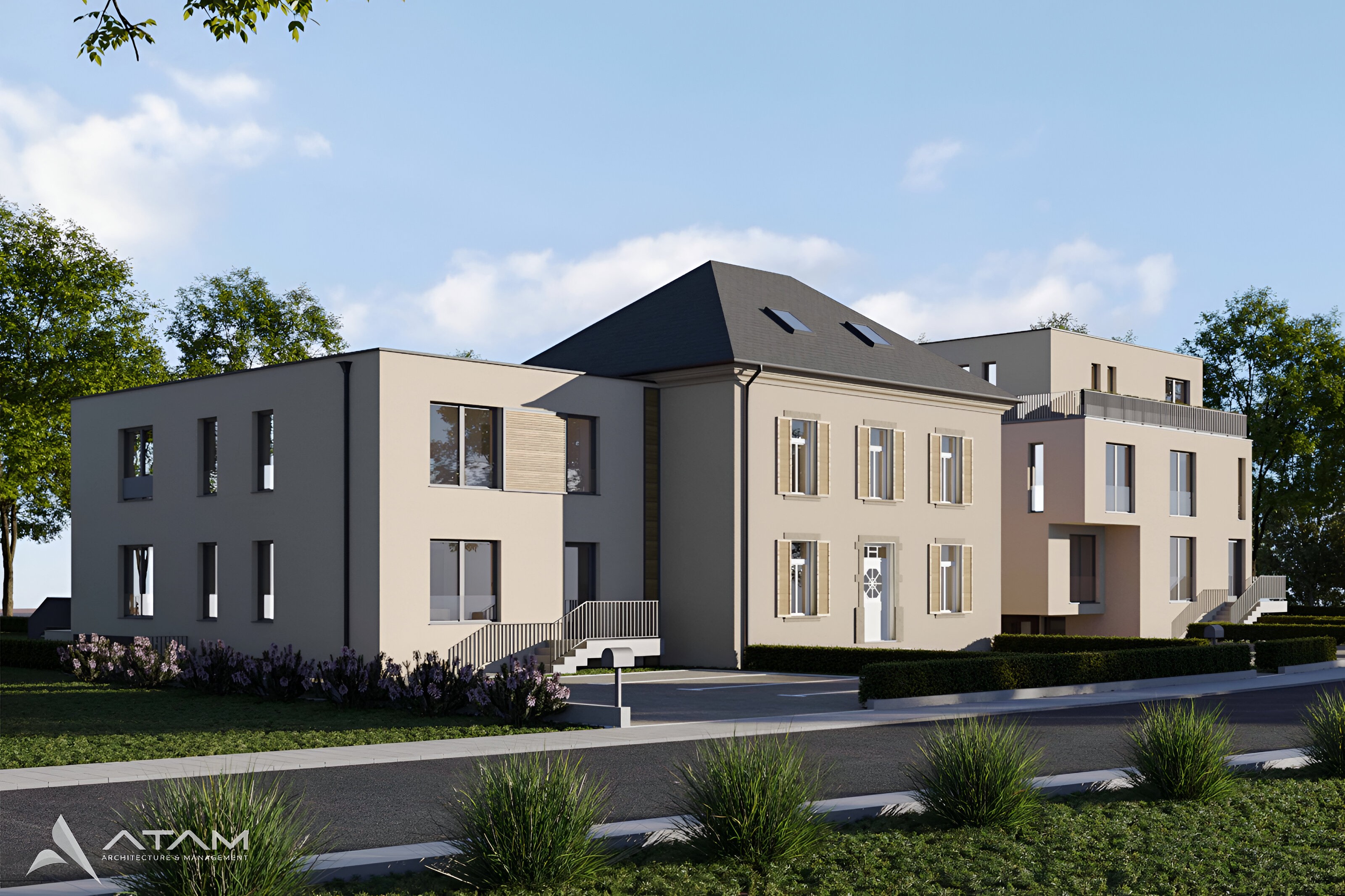 This project in the Luxembourgish village of Rippweiler represents a sophisticated exercise in contextual densification and heritage preservation. The site’s development is anchored by a centrally located, nationally protected residence, which served as the primary architectural compass for the intervention under strict INPA (Institut national pour le patrimoine architectural) guidelines. The revitalization of the historic core focuses on restoring the integrity of its traditional massing, including its symmetrical fenestration and classic hipped roofline. Flanking this heritage centerpiece are two contemporary bi-familial houses that respect the scale and "breathing room" of the original structure. These new volumes employ a minimalist, cubic geometry and a neutral lime-wash palette, ensuring they act as a quiet, modern backdrop rather than competing with the historic facade. By utilizing recessed balconies, clean-lined railings, and integrated landscaping, the design achieves a cohesive residential enclave. The transition between the old and the new is managed through careful site topography and consistent materiality, successfully doubling the site's density while honoring the specific architectural soul of the protected Luxembourgish manor.