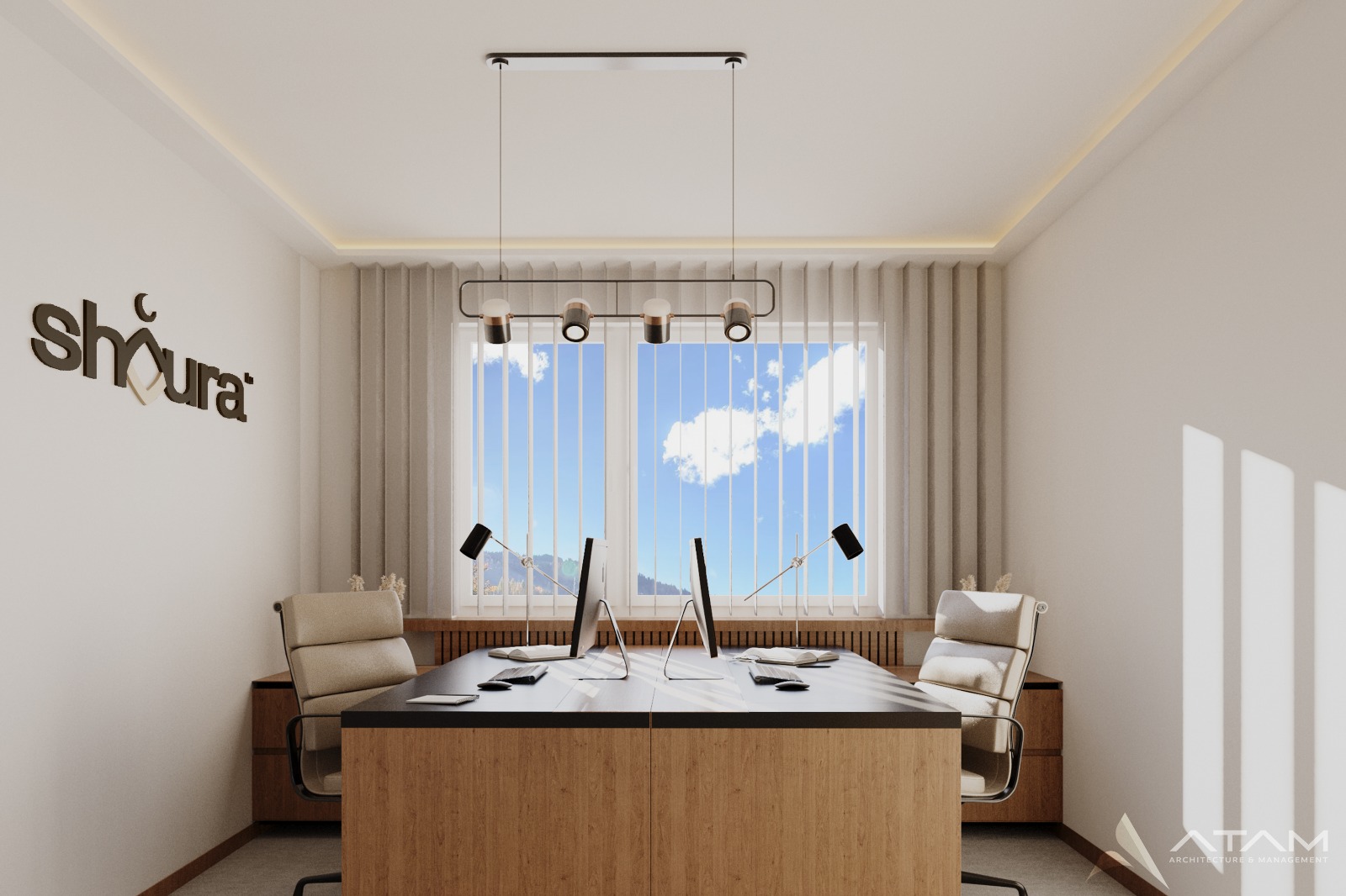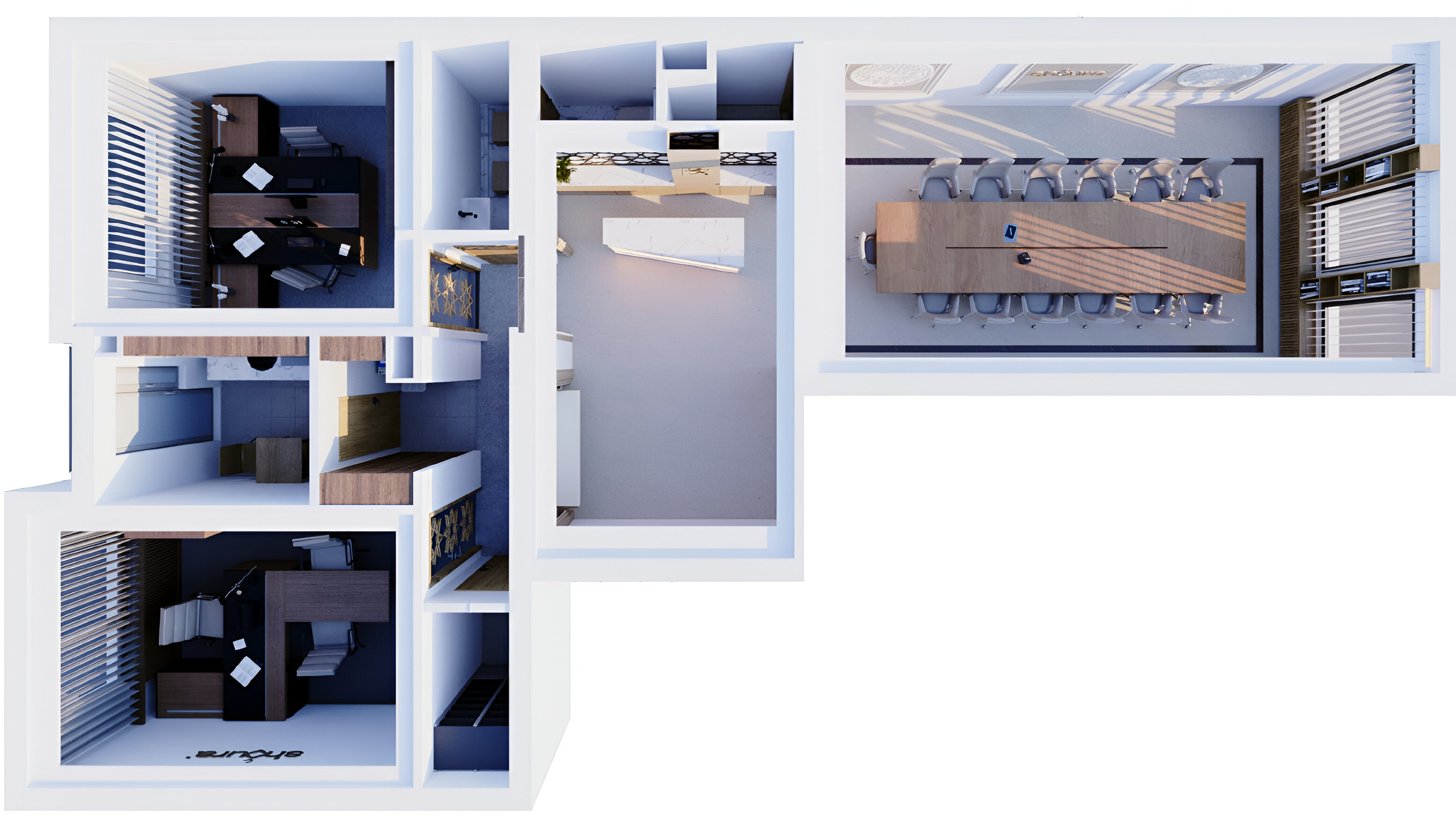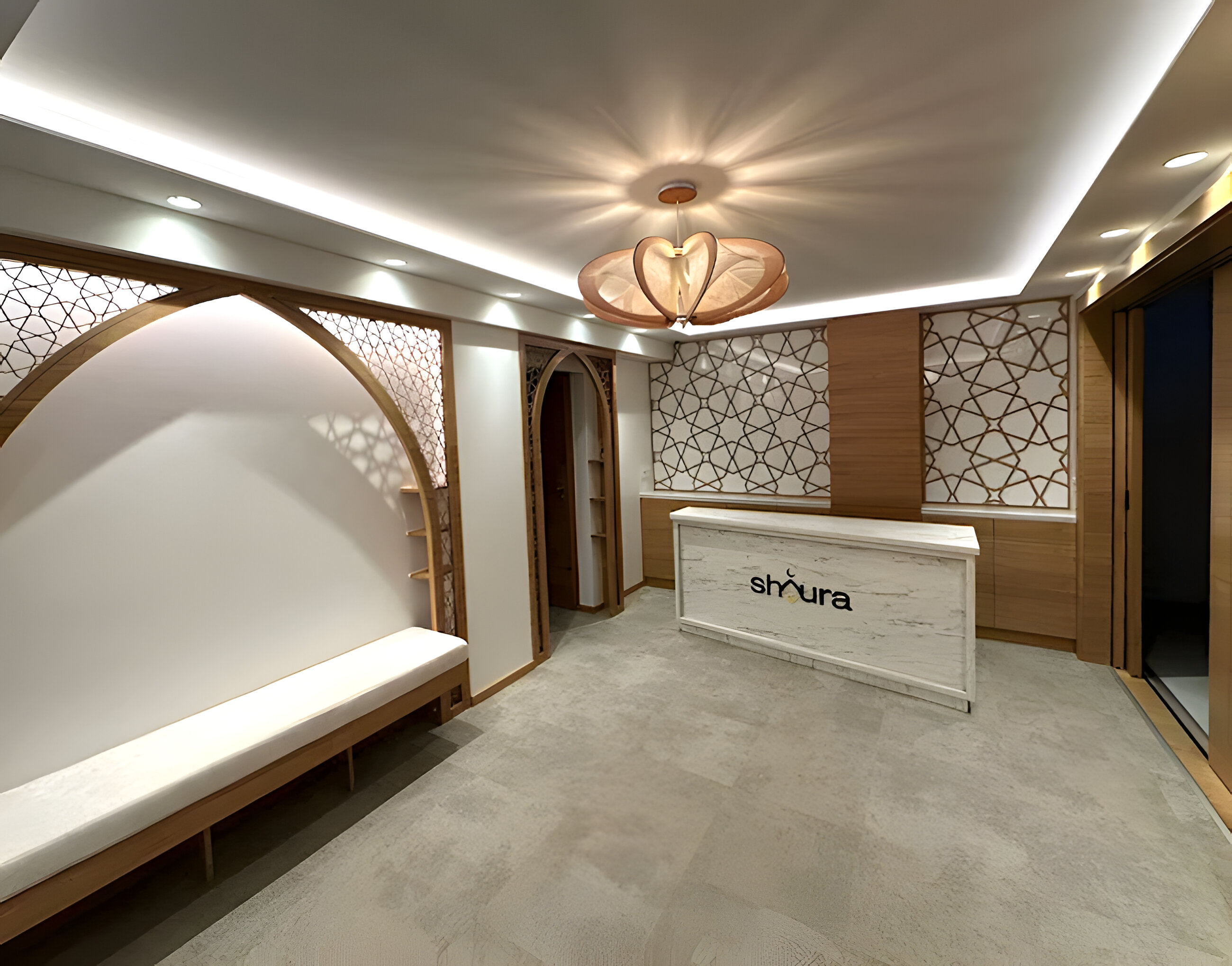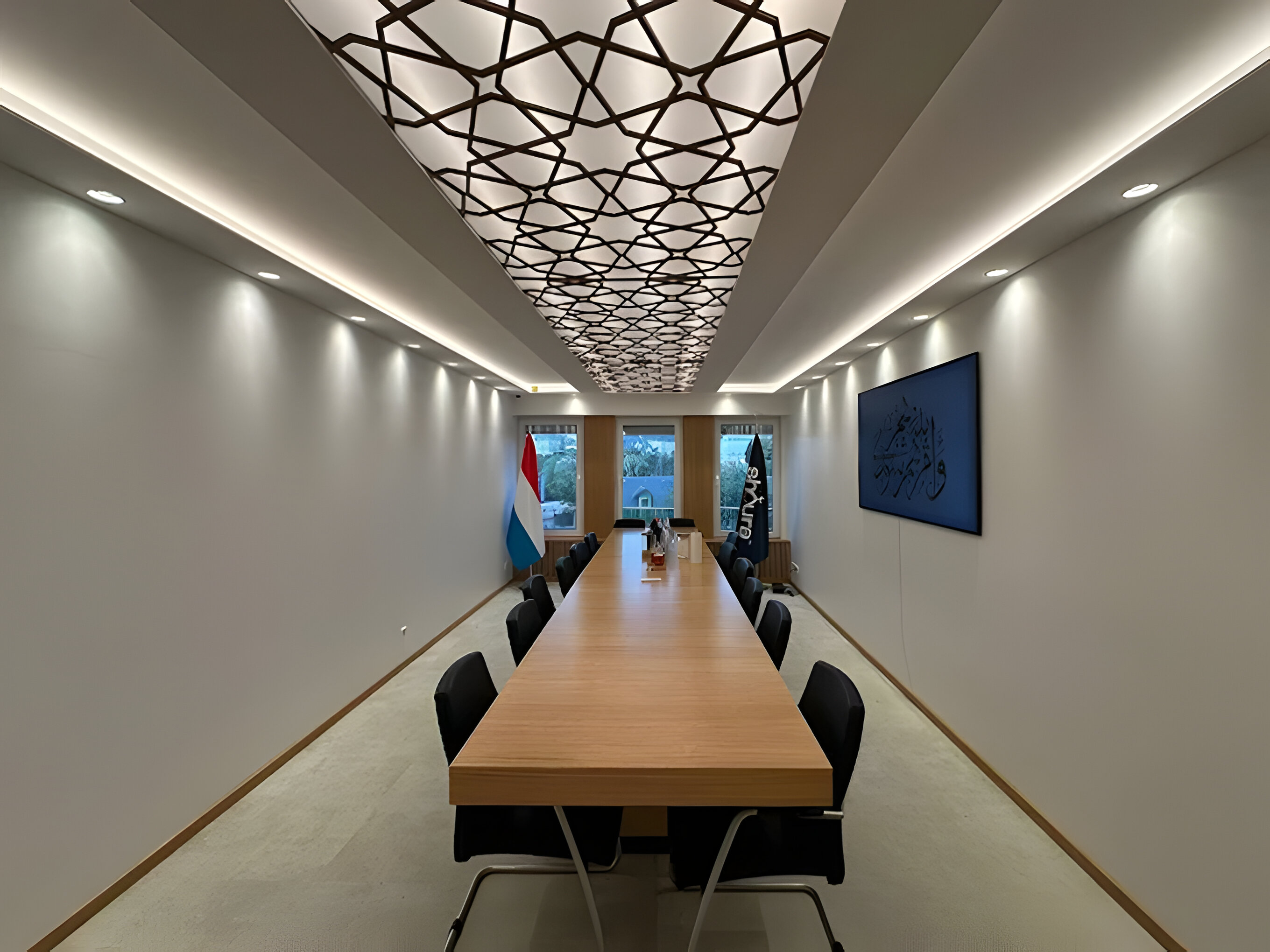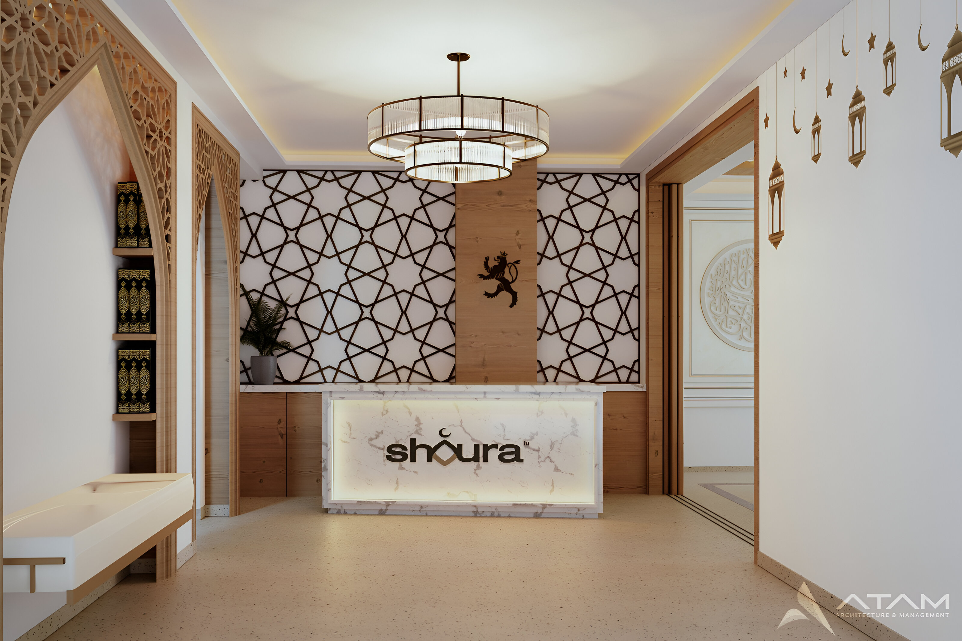 The Shoura serves as the officially recognized religious council representing the Muslim community in Luxembourg, acting as the primary interlocutor between the community and the State. This project involves the strategic conversion of an existing residential apartment into high-functioning office spaces tailored to the Assembly’s administrative and representative needs. The interior architectural language is executed in a contemporary Islamic decorative manner, characterized by the integration of intricate geometric fretwork, calligraphic wall reliefs, and a warm palette of natural timber and marble that harmonizes traditional motifs with a professional, modern workplace aesthetic.