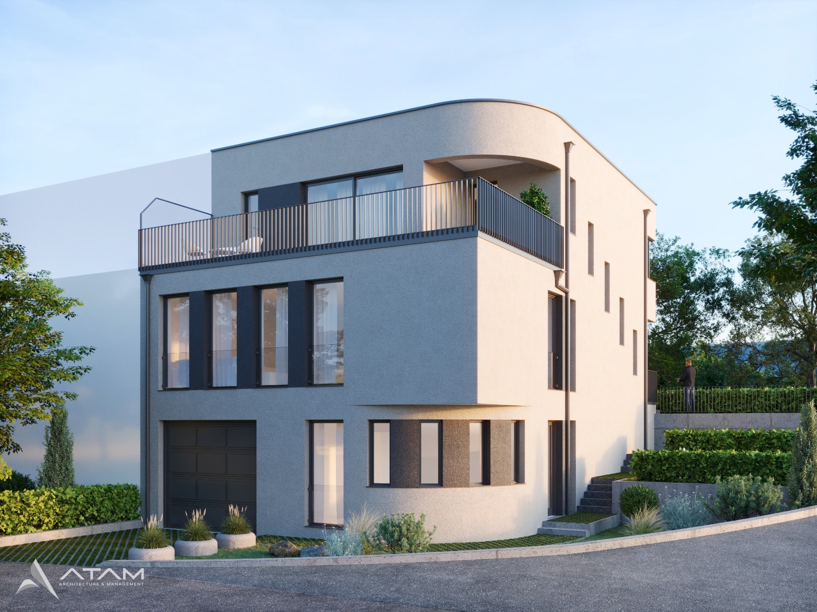 Situated within the new Heidert PAP development in Wiltz, this single-family residence is conceived as a compact, contemporary volume carefully integrated into the sloping terrain. The architecture is defined by a clear cubic form, subtly softened by a gently curved roofline that gives the house a distinctive yet restrained identity. Organized across multiple levels, the dwelling responds directly to the topography, with garage and service functions anchored at street level and the primary living spaces elevated to capture light and views. A continuous balcony extends the upper floor outward, strengthening the relationship between interior and landscape. The façade combines a light mineral render with dark-framed openings, creating a precise and balanced composition. Generous glazing enhances natural daylight, while the rhythmic placement of windows ensures privacy within the emerging residential fabric. The result is a refined, context-sensitive home that balances clarity of form, functional efficiency, and contemporary residential living.