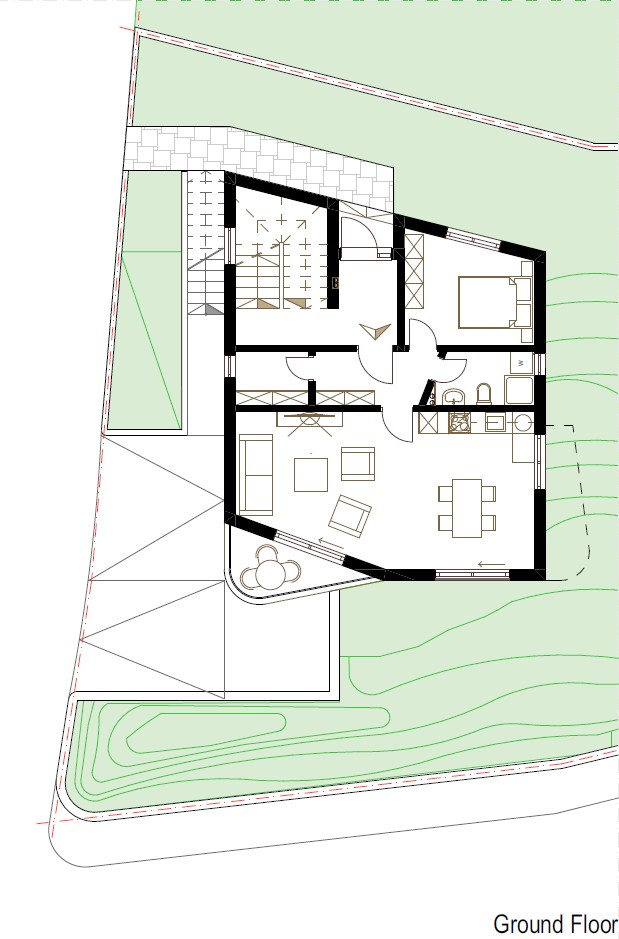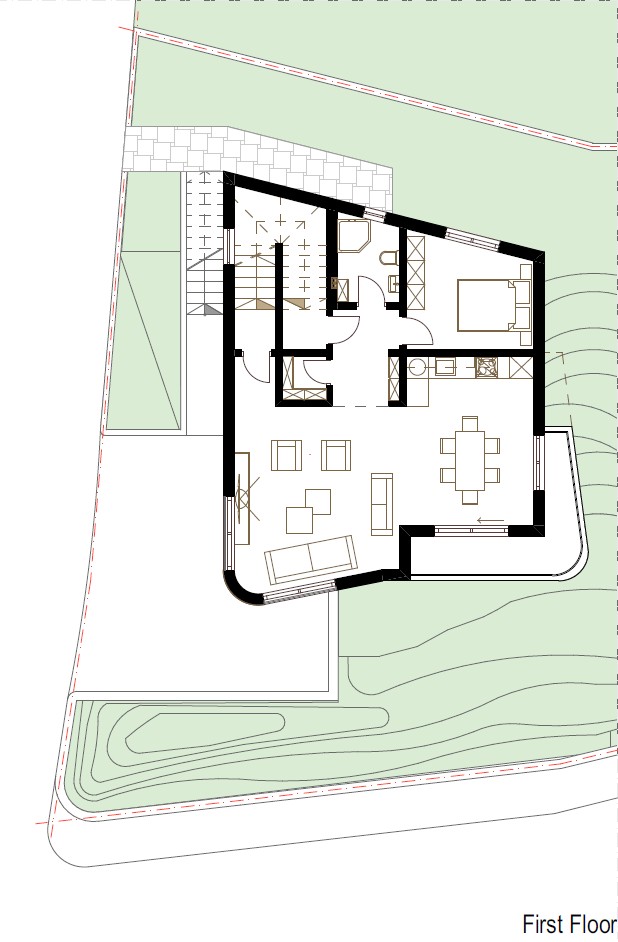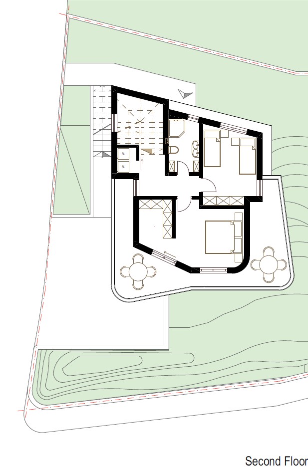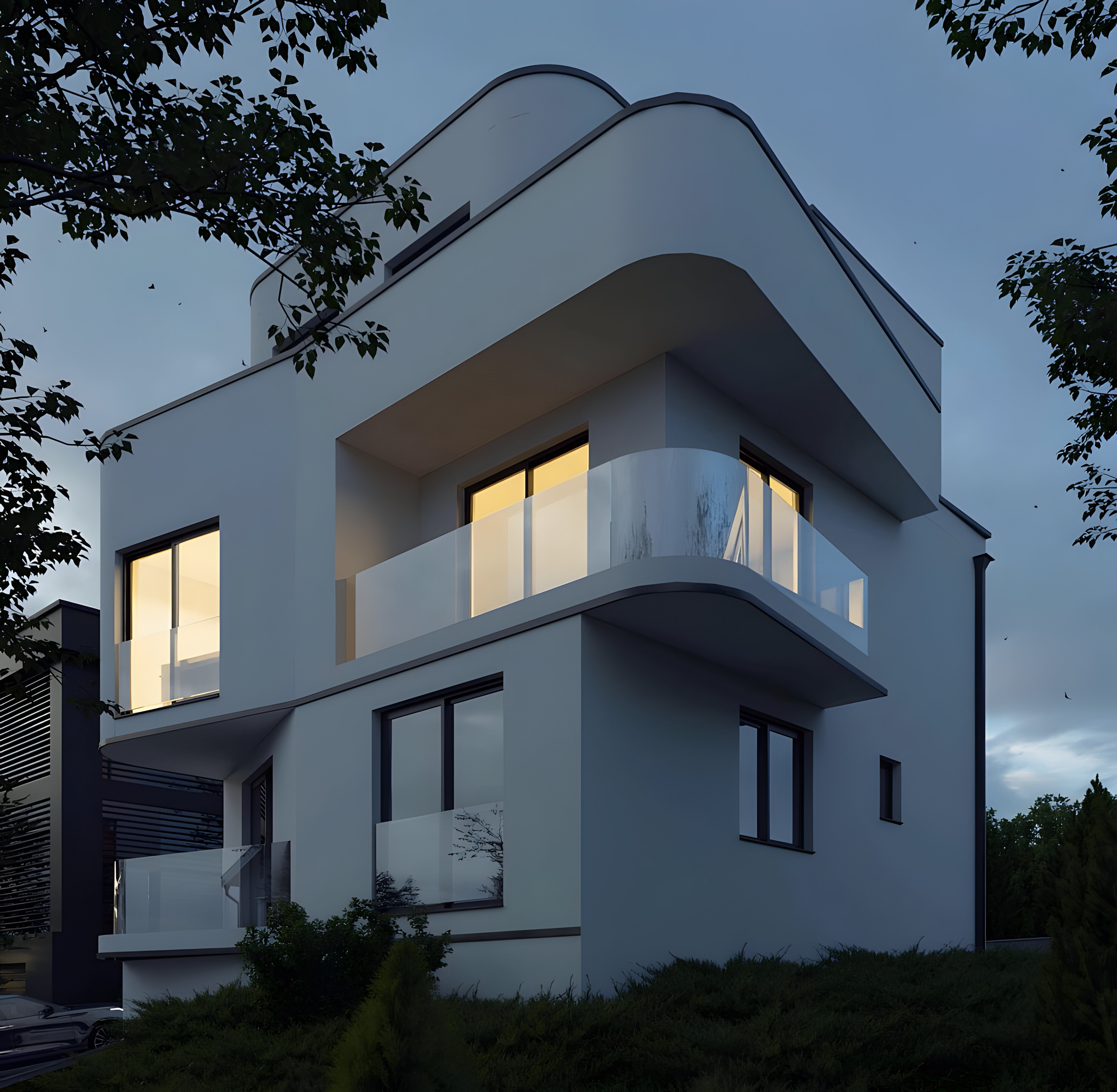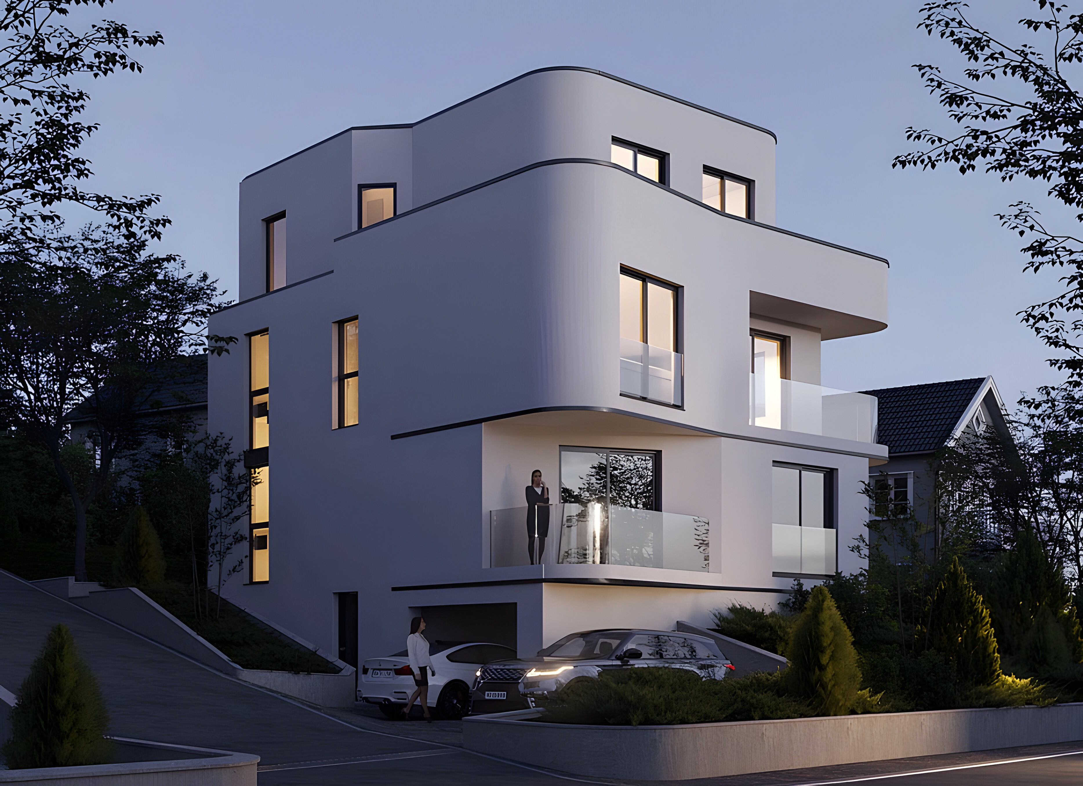 Located in the riverside town of Grevenmacher, Luxembourg, this contemporary residence comprises two distinct dwelling units organized across four levels, including a basement, ground floor, and two upper storeys. The architecture departs from the traditional block form, utilizing a sculptural, tiered massing characterized by soft, rounded corners and deep architectural recesses that create a dynamic interplay of light and shadow. The building’s vertical program is articulated through a series of staggered terraces and cantilevered balconies, which provide private outdoor pockets for each unit while maintaining a unified aesthetic. A clean, white monochromatic render is punctuated by minimalist black metal detailing along the slab edges, emphasizing the fluid, wraparound geometry of the facade. The ground level is cleverly integrated into the site's topography, featuring a recessed subterranean garage and a primary entrance that maintains a low-profile street presence. Floor-to-ceiling glazing and transparent glass balustrades ensure that the interior living spaces are flooded with natural light, offering expansive views of the Grevenmacher landscape. This design successfully balances high-density living with the privacy and formal elegance of a standalone sculptural villa.